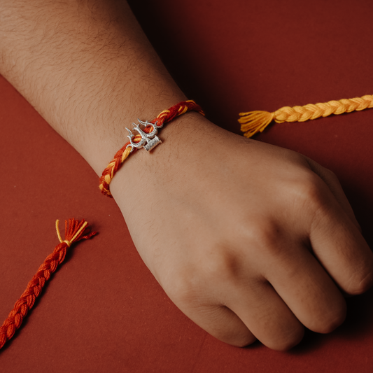 Rakva 92.5 Sterling Silver Rakhi For Brother | Trishul Sign Bracelet | Rakhi for Men and Women | With Roli Chawal Tilak for Kids