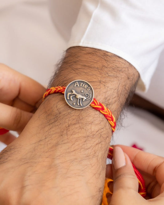 Rakva 92.5 Sterling Silver Rakhi For Brother | Aries Sign Bracelet | 2 in 1 Brooch/Rakhi for Men and Women | With Roli Chawal Tilak for Kids