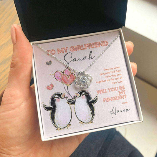 Girlfriend Necklace, Girlfriend Gift, Will You Be My Penguin Personalized Necklace, Cz Love Knot Necklace For Girlfriend
