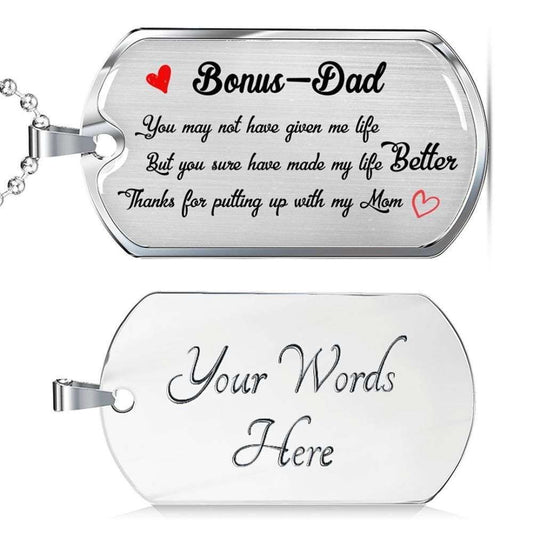 Bonus Dad Dog Tag, Thanks For Putting Up With My Mom Dog Tag Military Chain Necklace For Bonus Dad