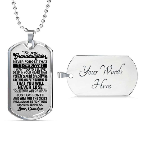 Granddaughter Dog Tag Custom Picture, Never Forget That I Love You Grandpa Giving Granddaughter Dog Tag Military Chain Necklace