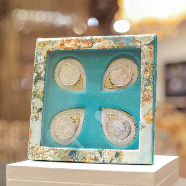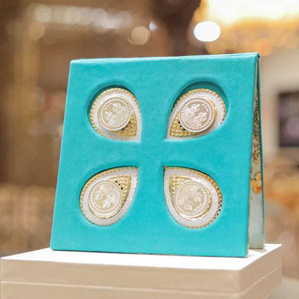 This Diwali, open the door to a world of blessings and prosperity with RAKVA's exclusive offering – a pack of four 999.9 Purity Ganesh Lakshmi ji Silver Coins. Each coin is meticulously crafted and comes with a silver authenticity certificate, ensuring that you possess not just silver but a timeless investment in your hands.