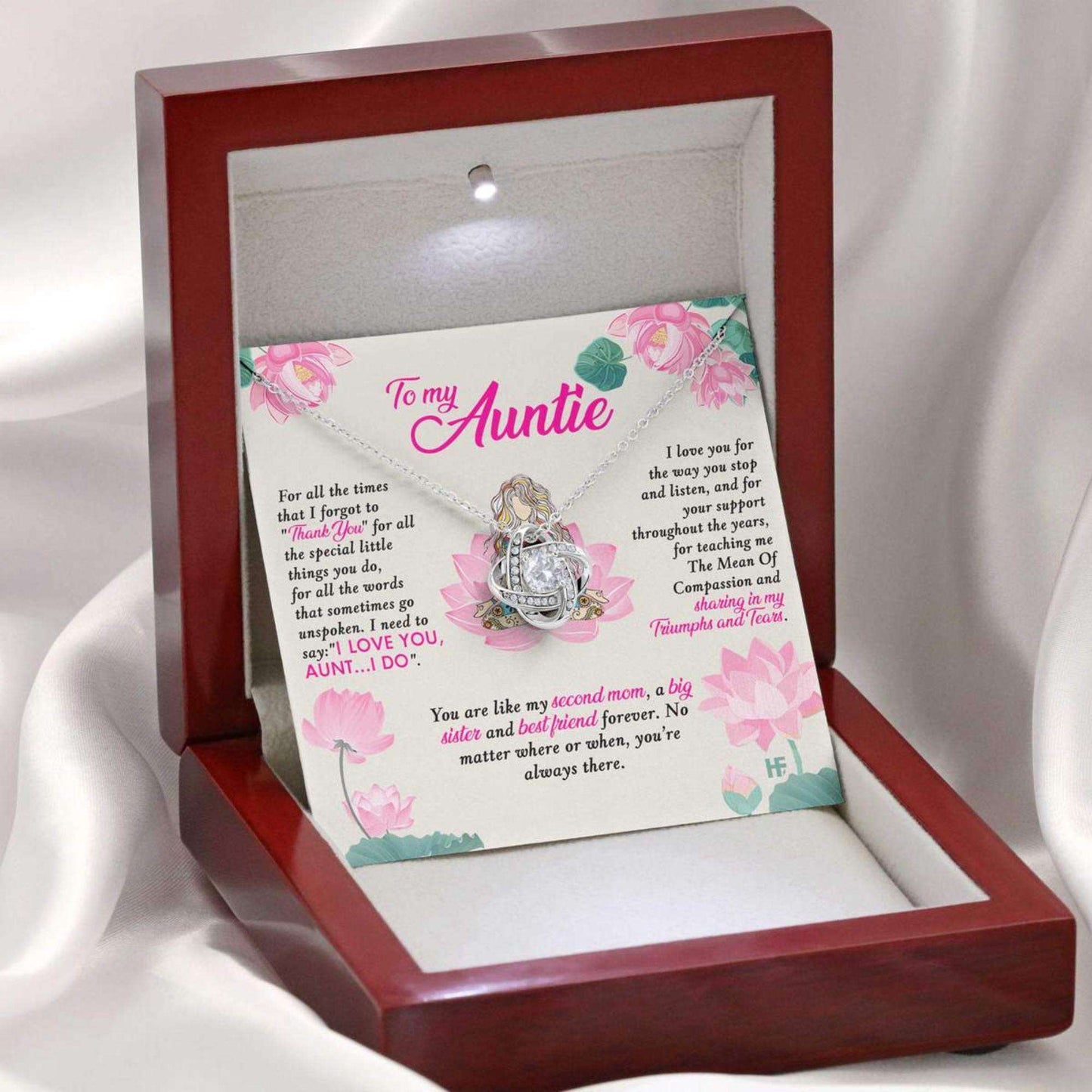 The Love Knot symbolizes the unique and enduring relationship between you and your aunt. It's a beautiful way to celebrate the special connection you both treasure.