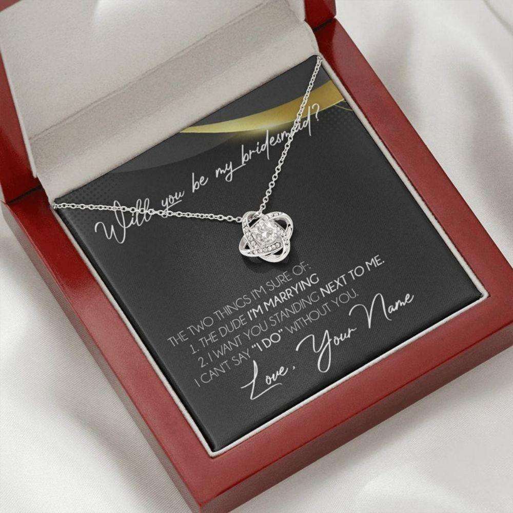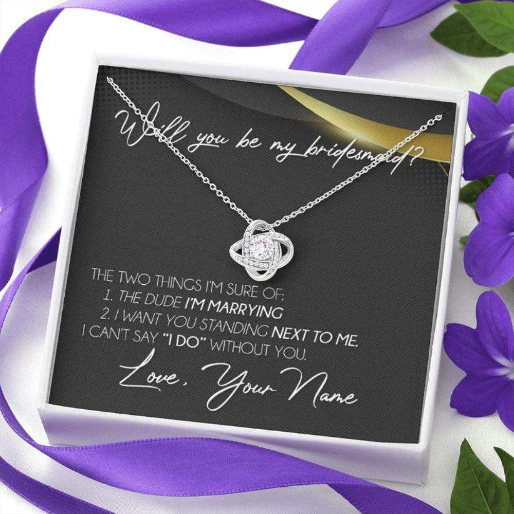 Personalized Bridesmaid Proposal Necklace – “Will You Be My Bridesmaid?” – 14k White Gold over 925 Sterling Silver Love Knot